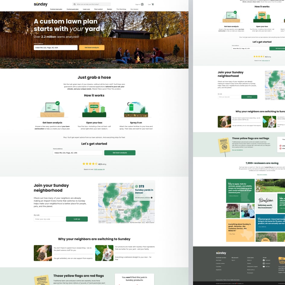 Sunday Lawn Care is a revolutionary DTC brand that delivers personalized, environmentally responsible lawn care plans based on scientific data and user-specific insights. With a booming presence in the U.S. and a mission rooted in sustainability, their digital platform needed to convey trust, precision, and lifestyle appeal—all while educating customers and converting visits into subscriptions.